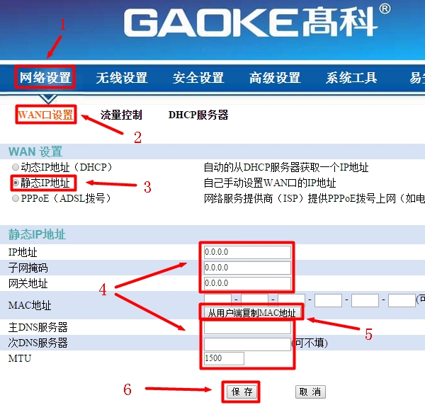 点击“网络设置”——>“WAN口设置”——>选择“静态IP地址”——>填写宽带运营商提供的“IP地址”、“子网掩码”、“网关”、“DNS”——>点击“从用户端复制MAC地址”——>点击“保存”。
